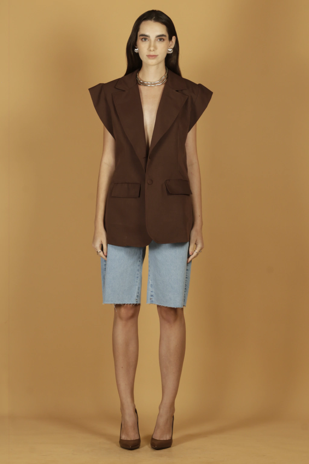 O Colete Blazer Feminino Marrom com Ombreiras Estruturadas é a peça statement perfeita para elevar qualquer produção com modernidade e elegância. Confeccionado em tecido de alfaiataria leve e estruturada, ele apresenta modelagem alongada e caimento impecável que valoriza a silhueta com sofisticação.